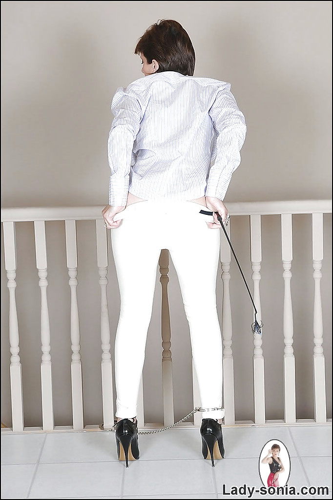 Зрелая женщина сама себя пристегнула наручниками за ногу к лестнице, чтобы стоять на одном месте и далеко не уходить от камеры. Она постоянно в кадре и пытается показать все части своего привлекательного тела. Не смотря на то, что лицо дамы постарело, ее сиськи до сих пор упругие. Вагину дама бреет не смотря на возраст. К тому же, иногда она даже сама себя удовлетворяет.