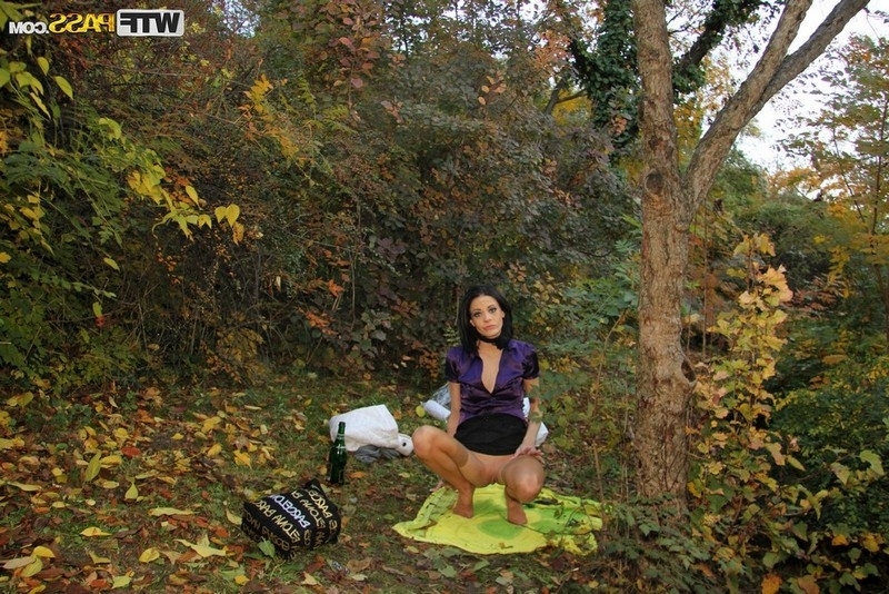 Горячая французская красотка во время прогулки с мужем сильно завелась и отправилась с ним в ближайшие кусты, где лихо оседлала стояк супруга и по быстрому прокатилась на нём. Но мужику похоже было мало и забрав её трусики, он уговорил сучку трахнуть себя бутылкой, а потом рукой.