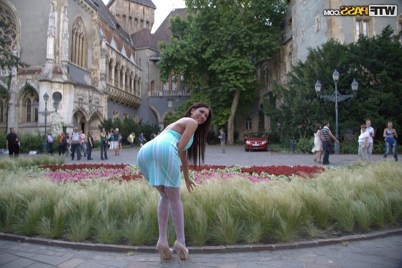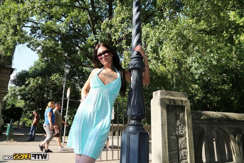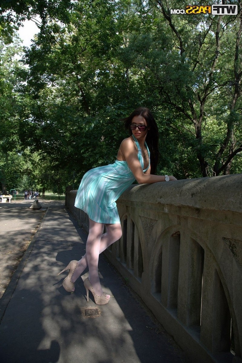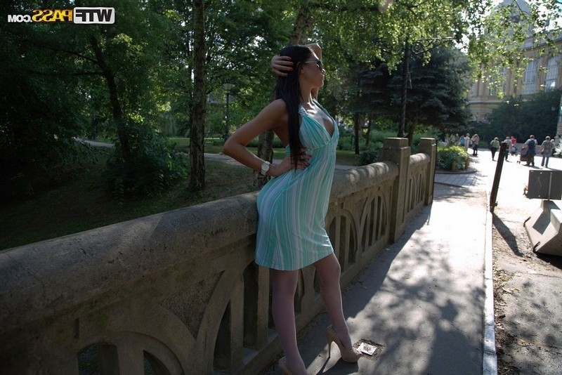 Фотоотчёт о приключениях стройной нудстки, что разгуливая по городу сверкала то голыми сиськами, то задирала своё платьице, демонстрируя всё что находилось под ним, ну а выбравшись за город, она вовсе не стала сдерживаться, устроив своеобразный стриптиз перед камерой.