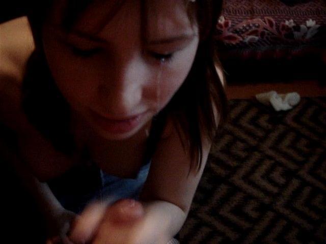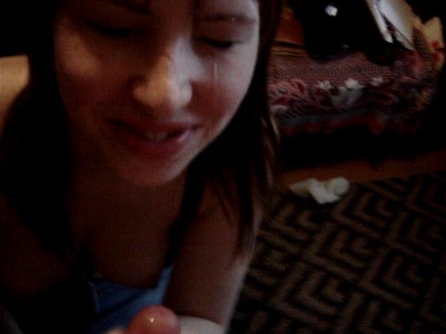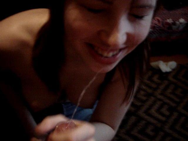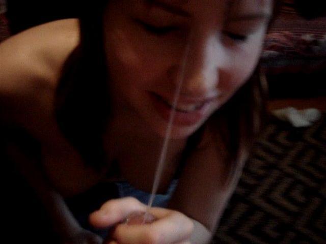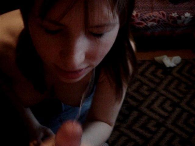 Девица не сразу заметила, что партнер снимает ее на камеру. Она была удивлена его поступком, но не запретила съемку, так как в итоге сама хотела посмотреть, что из этого получиться. В комнате было достаточно темно, но парочку это не смущало. Красавица, стоя на коленях, нежно ласкала член партнера. Она облизывала его и даже покусывала, помогая своими ручками довести парня до оргазма.