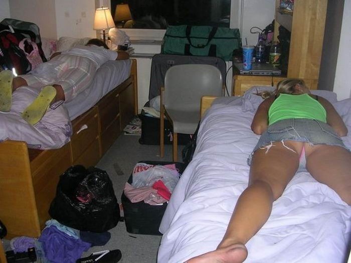 Бурная ночь с множеством алкогольных напитков не прошла бесследно для этих молодых особ. Они с трудом могут открыть глаза утром, не в силах оторвать голову от подушки. Лишь приняв банку энергетика любительницы тусовок начинают приходить в себя. Но они забыли, что после сна нужно одевать на себя нижнее белье, засветив все прелести во время сонного хождения по дому.