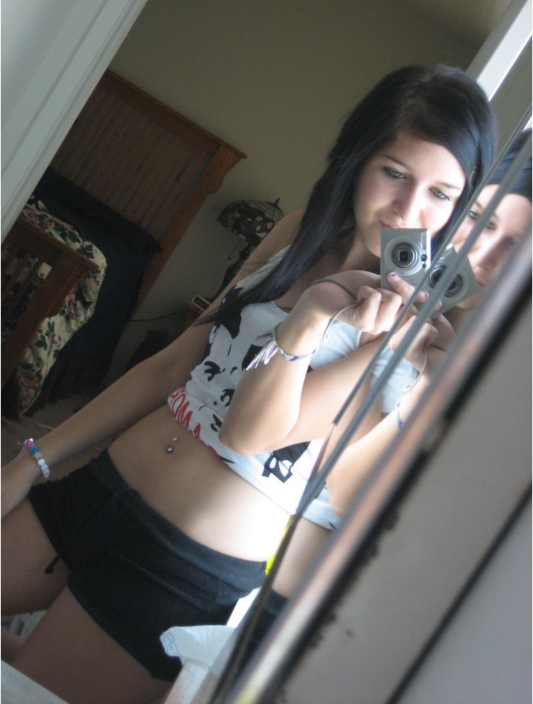 Задорные милашки легко соглашаются на просьбы знакомых по сети прислать свои эротические селфи. Они не стесняясь оголяют тела, чтоб сделать пикантные селфи. Девица стоит перед зеркалом бочком, демонстрируя большие сиськи отличной формы, с очень возбуждающими сосками и слегка оттягивает трусики, показывая аккуратную полоску стриженых волос на лобке.