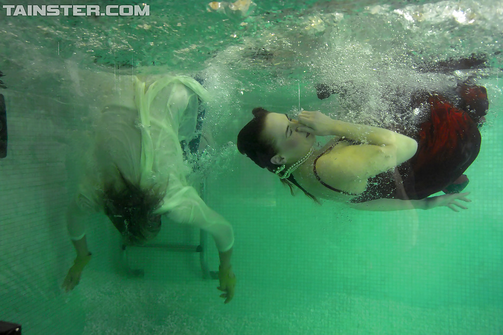 Девицы устроили фотосессию около бассейна. Белокурая стройная телочка, снимает на телефон рыжую бестию. И вдруг, рыжухе захотелось немножко пошалить и она прыгнула в воду в длинном платье. Блондинка отправилась вслед за ней, не снимая брюки и сапоги. Шалости так возбудили девушек, что они принялись целоваться в воде, и гладить свои тела перед тем, как раздеться.