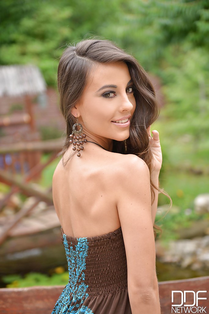 Милашка приехала в деревню проведать родственников. Оказавшись на свежем воздухе, новоявленная крестьянка нарядилась в длинный сарафан, подходящий к местности и принимается знакомиться с красивейшими пейзажами. Девушка присела на скамейку и подняла стройные ножки, шаловливые пальчики потянулись к нежной промежности и наслаждали щелочку мастурбацией.