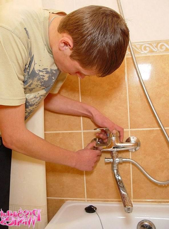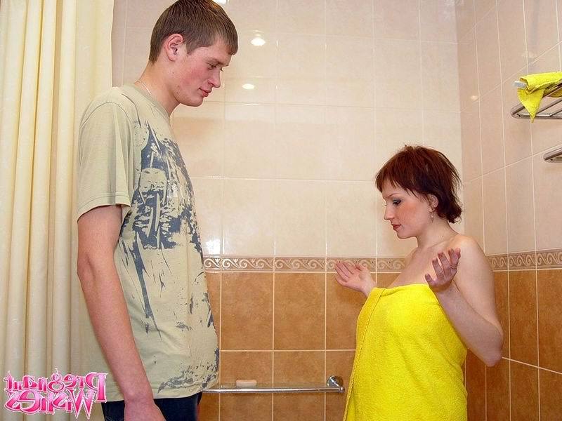 Эта телка решила искупаться, но ей потребовалась помощь парня. Она стоит посреди освещенной комнаты и снимает свой халат синего цвета. После этого брюхатая девка снимает с себя трусы и включает кран. Девка обмылась под душем и обмоталась полотенцем. Однако, ей кто-то позвонил, поэтому парень зашел в ванную, чтоб дать трубку. Телочка пообщалась и парень принялся разглядывать её. Вот она сняла с себя полотенце и предстала во всей красе перед ним. Тот показал жестом что она – супер. Палец вверх подействовал на телочку волшебным образом. Он просто сделал ей комплимент, а она разрешила потрогать свои сиси, после чего стала на колени и принялась отсасывать